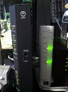 左の一番大きいのがNTTのフレッツ光のモデムで、右の白いのと